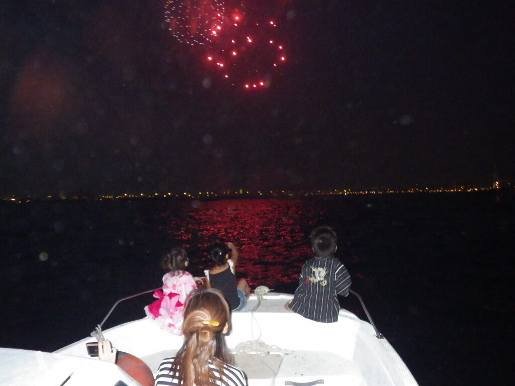 船上から見上げる花火は、迫力満点ですが、見上げすぎて首を痛める事もしばしば・・・・